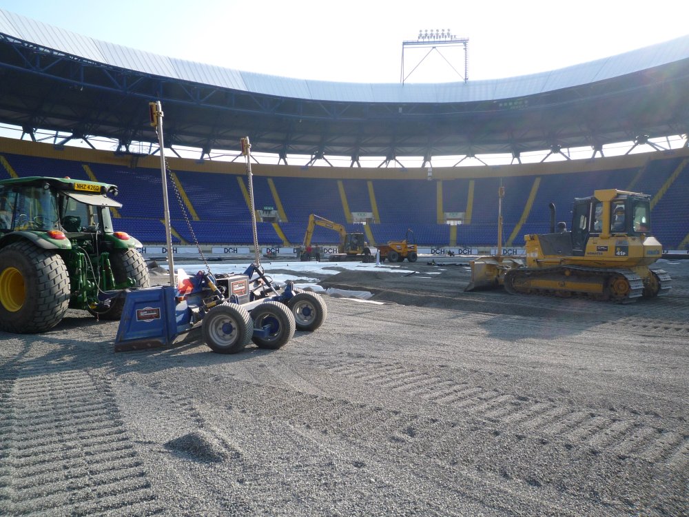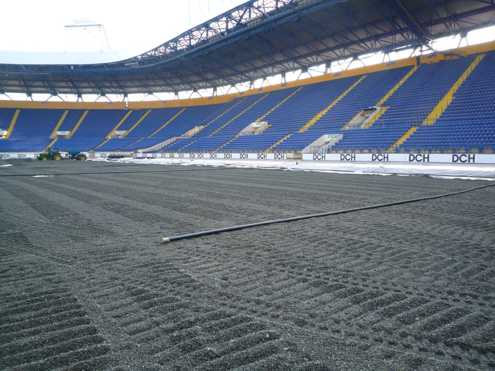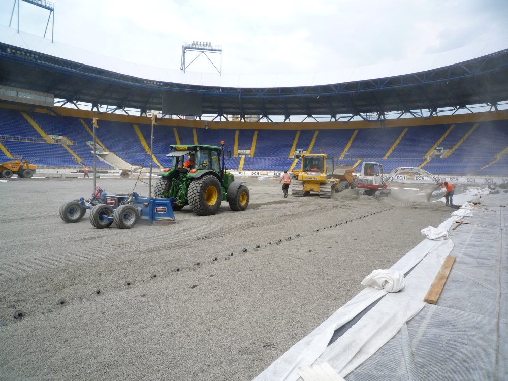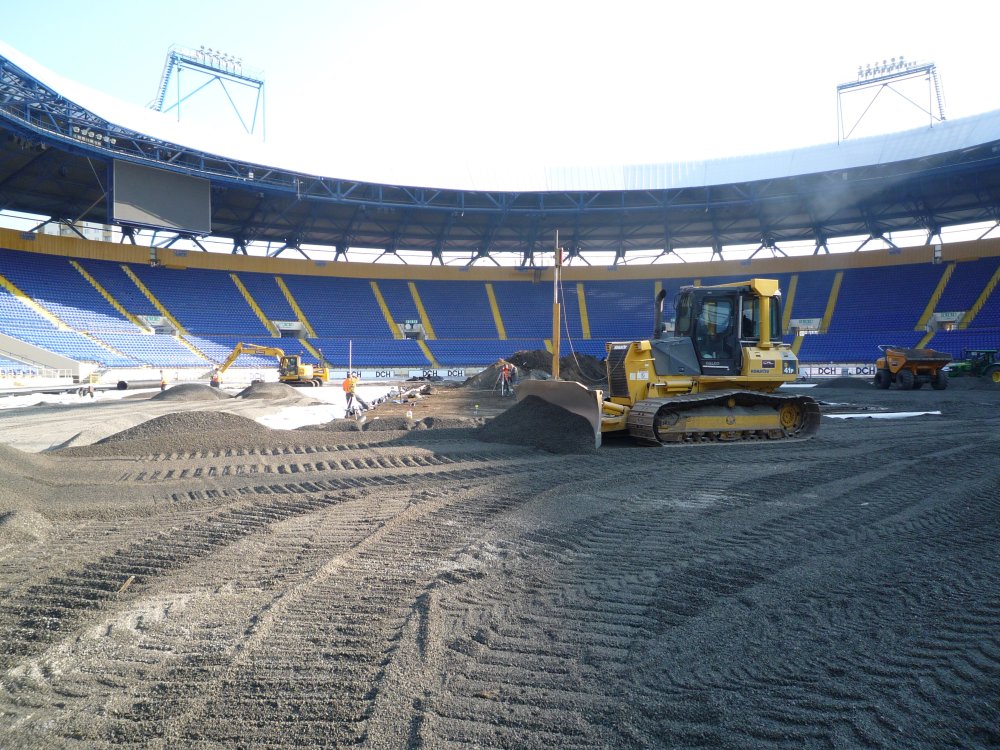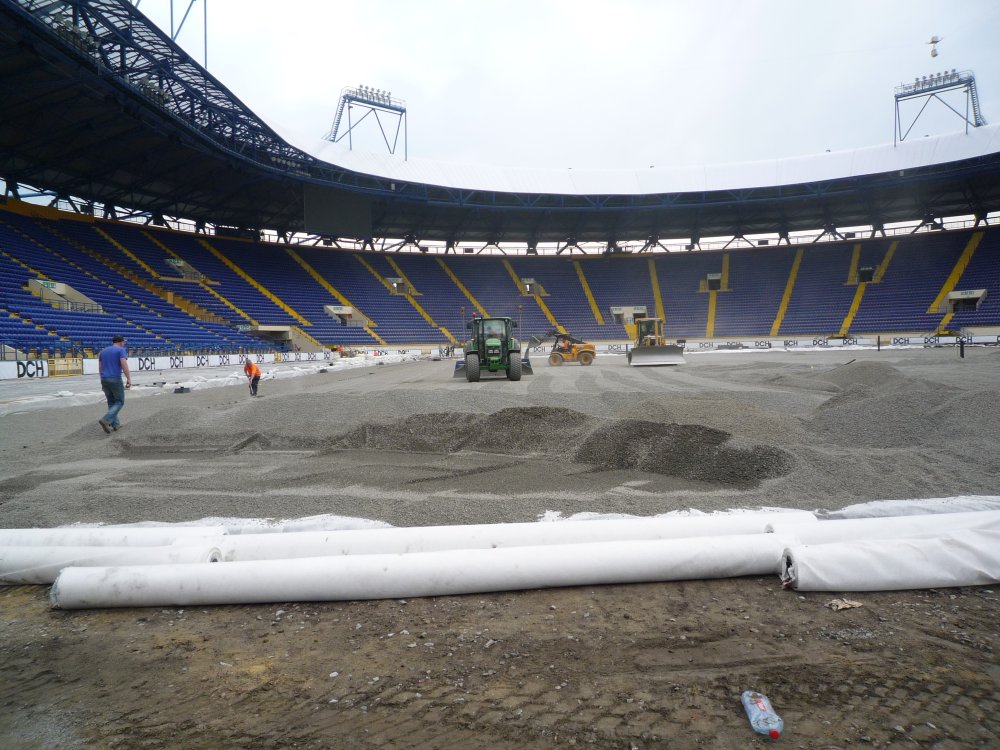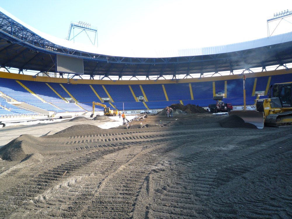 Z toho dôvodu firma Engo spolupracovala s írskymi firmami, STRI a CRL ktoré dlhodobo spolupracujú s UEFA. 16.4.2011 vo večerných hodinách sme sa zúčastnili posledného ligového zápasu , na starom trávniku. Ráno 17.4. o 7:00 začala rekonštrukcia trávnika. Behom piatich hodín bola z poloviny ihriska zhrnutá prvá vrstva pôdy.