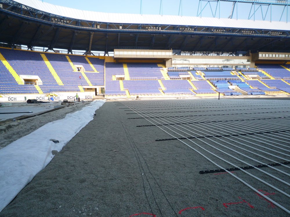Po inštalácii drenážno ventilačného systému, závlah a navezenia štrkovej vrstvy, prišlo na rad vykurovanie. Zváralo sa hlavné potrubie, montoval výmenník tepla, kládli hadice na štrkovú plochu.
