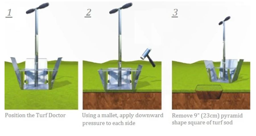 Turf Doctor je presný nástroj na opravu trávnika, ktorý odstraňuje štvorcový pyramídový trávnik s rozmerom 23 cm. Minimalizuje stratu koreňov a obnova je veľmi rýchla, čo umožňuje kompletnú opravu bez medzier medzi trávnikmi. Ideálny na profesionálnu opravu a údržbu trávnikov na golfových ihriskách, športoviskách a v zariadeniach profesionálnej starostlivosti o trávniky.